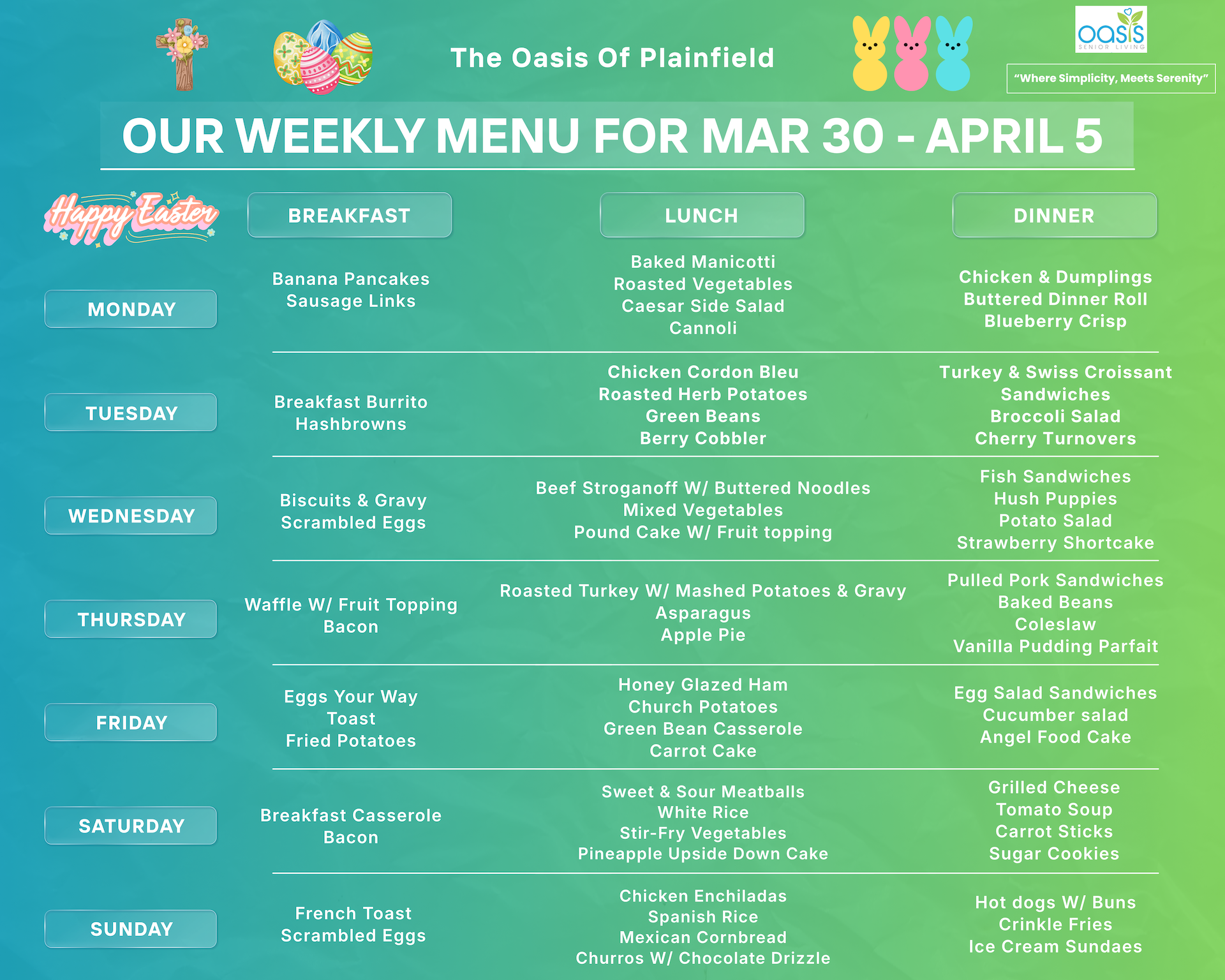 At Oasis of Plainfield, mealtimes are more than just nourishment—they’re moments of comfort and connection. Our talented culinary team prepares fresh, scratch-cooked meals daily, using wholesome ingredients and homestyle recipes that bring warmth and familiarity to the table. Whether it’s a hearty soup, a classic favorite, or a seasonal special, every dish is crafted with care and flavor in mind. We also thoughtfully accommodate special dietary needs whenever possible, ensuring every resident enjoys meals that are both satisfying and safe. It’s cooking that feels like home—because here, home is at the heart of everything we do.